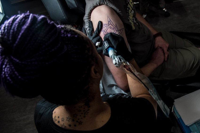 Mel Lockett applying a tattoo at Hart & Huntington Tattoo Co. Nashville