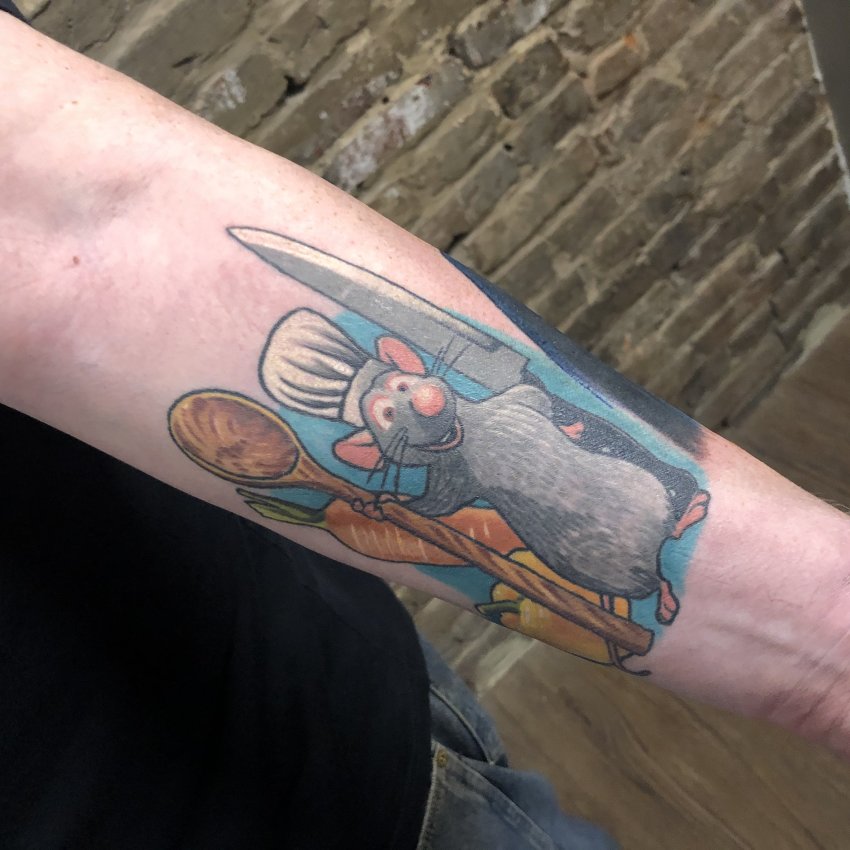 I loved Dustin’s work and felt confident with him the whole time. I came in with just a picture of the character Remi holding a carrot with some herbs and peppers around him. Dustin took it from there and added a wooden spoon and a chef’s knife. There hasn’t been a single thing I wished he didn’t do.
