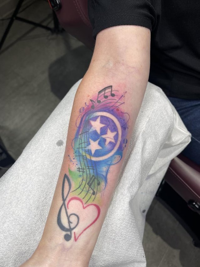 From Dolly Parton tributes and lucky guitars to music notes and signature song lyrics, a Tennessee- or Nashville-inspired tattoo can flow harmoniously with the body, in more ways than one.